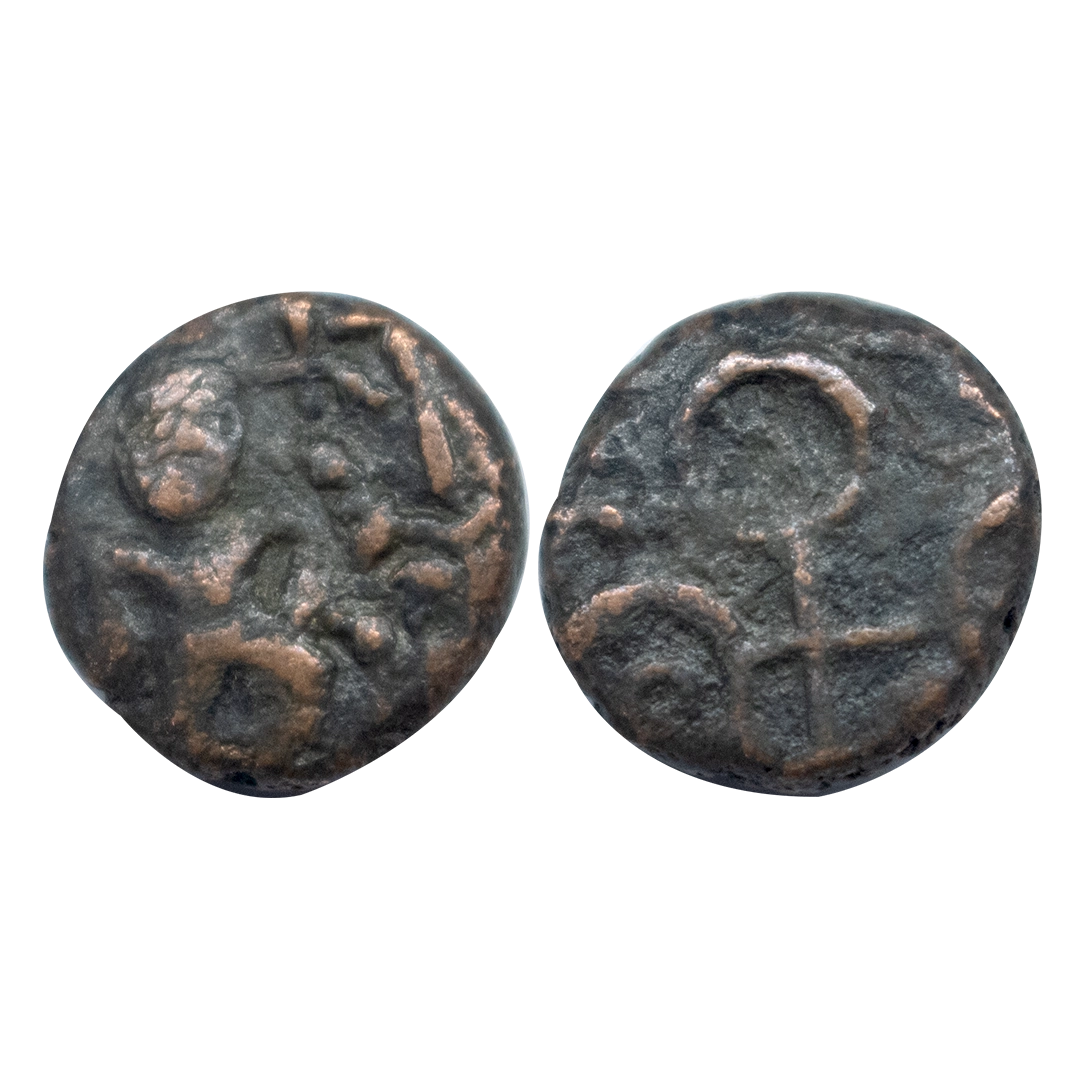 Ujjain, (1 century BC), Bull Type, Copper Unit, 5.96 gms, Obv. Bull to right with chakra symbol above, Rev. double orbed Ujjaini symbol with 4 swastiks, Pieper # 708, about very fine, scarce.