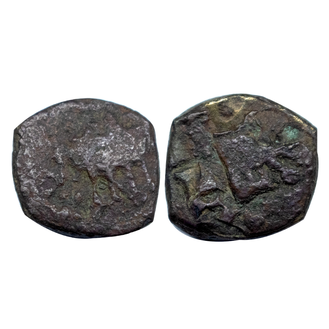 Kaushambi, Magha Dynasty, Vijayamagha (c. 3rd Century AD), Copper Unit, 3.50 gms, Obverse: Bull to right, Reverse: Motifs of Three arch hill (Chaitya) and Tree in railing, Brahmi legend below reading ‘(Vi)jayama(gha)’, Pieper # 1177, fine, scarce.