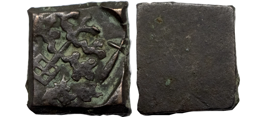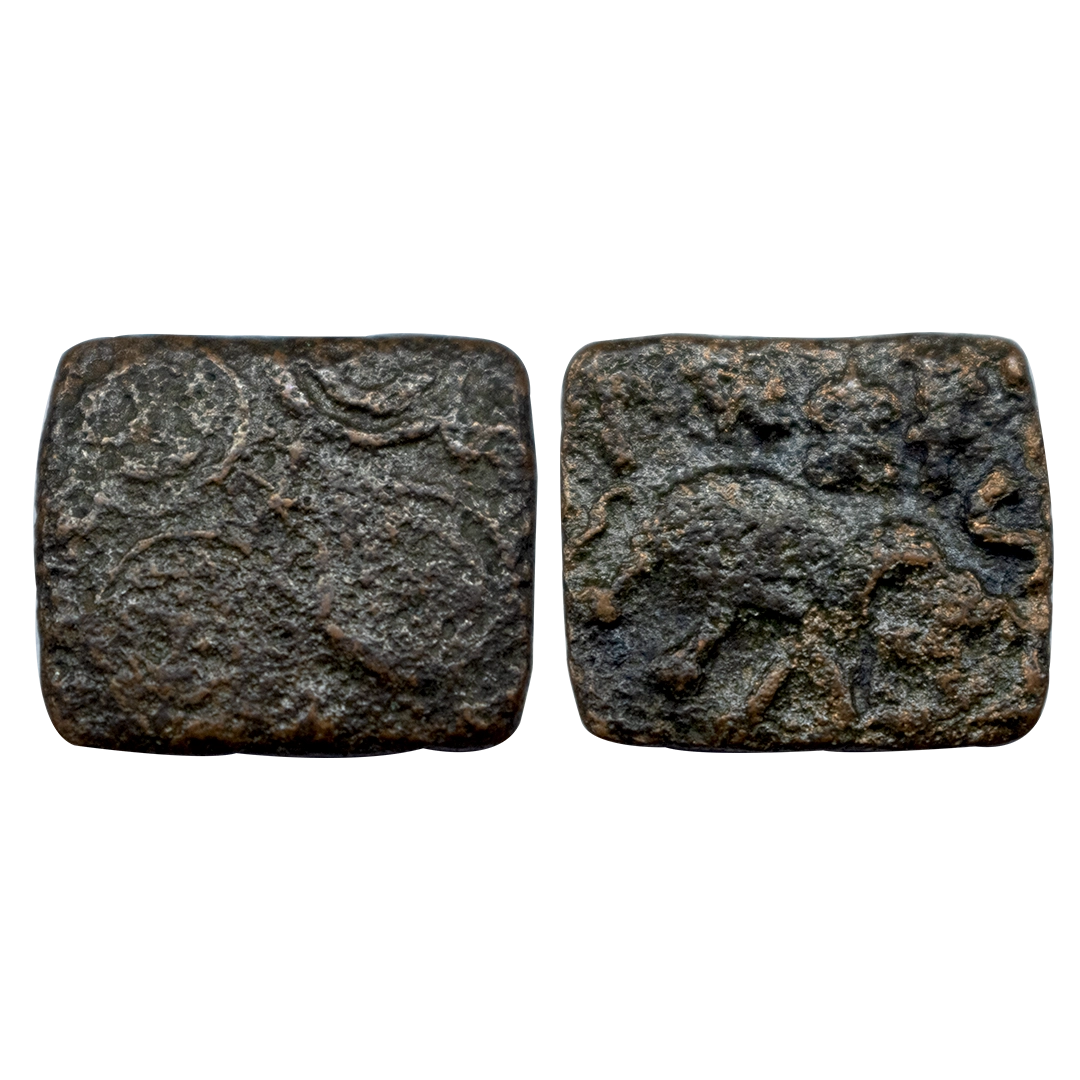 Vidarbha region, (2nd Century BC), Copper Unit, 1.08 gms, Obverse: A bull to right with ujjaini symbol above, Reverse: railed tree, Pieper #2323, fine to very fine, very scarce.
