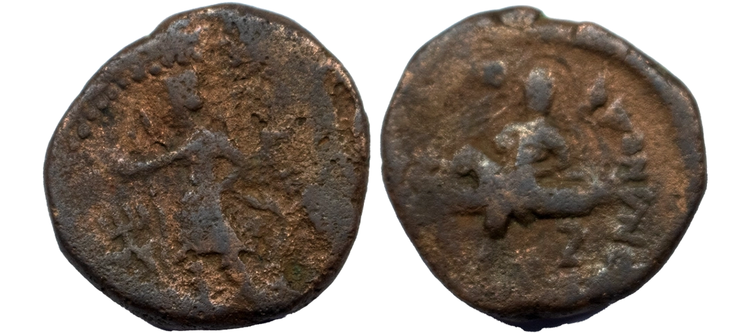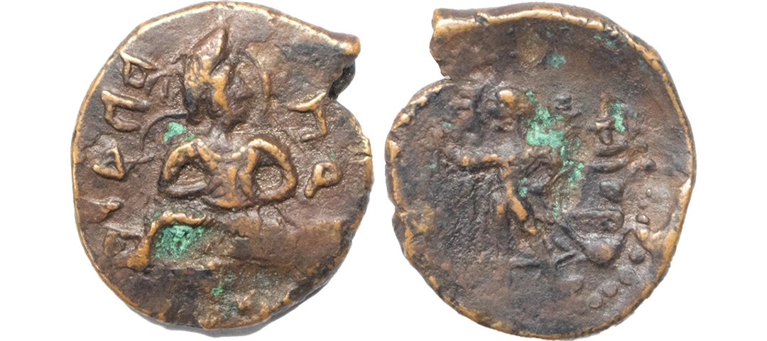 Kushanas, Kanishka I (c. 127-158 AD), Copper 1/4 Drachma, 4.29 gms, Obv: King standing facing head left, sacrificing over altar with Greek legend, Rev: Goddess Mao standing to left, about very fine, scarce.