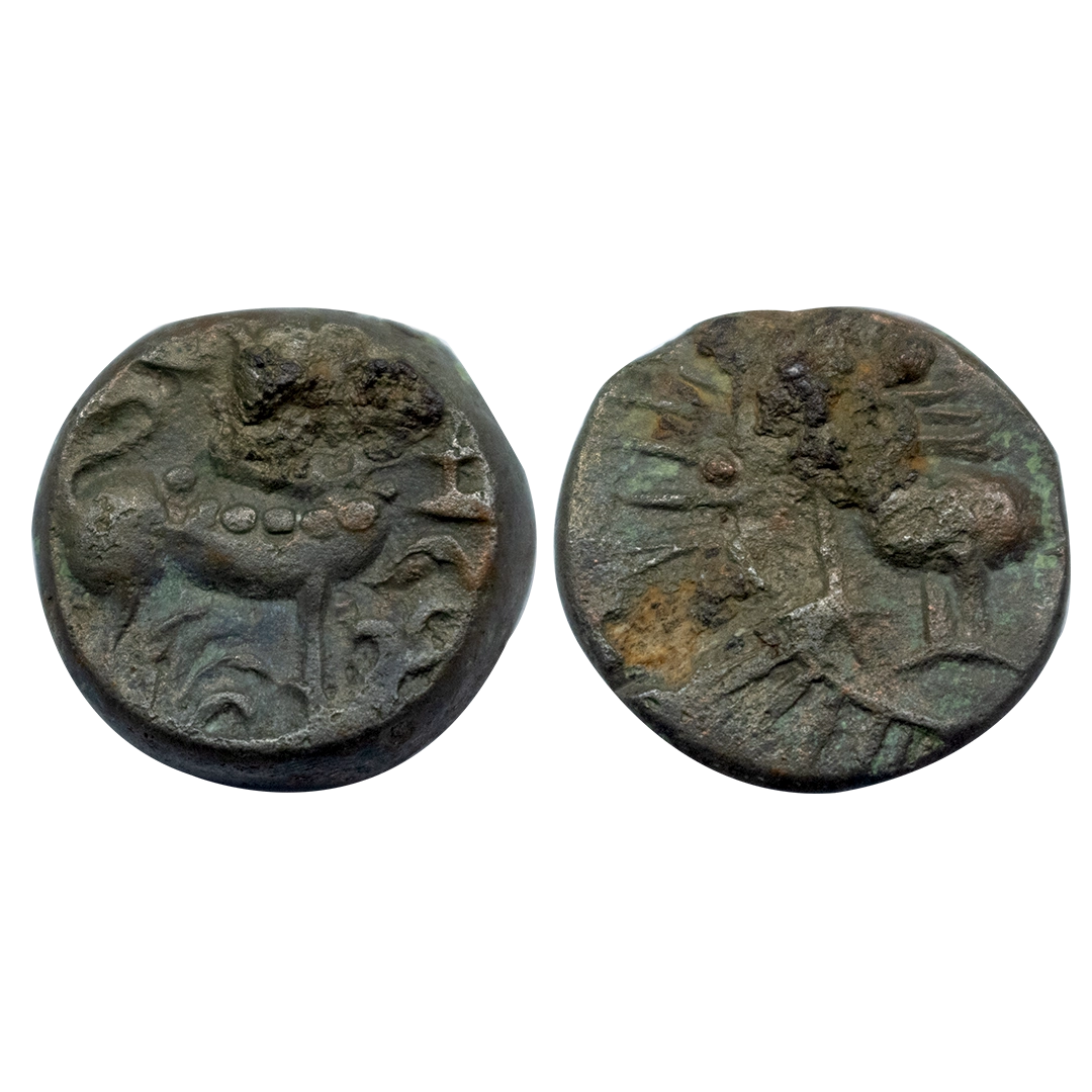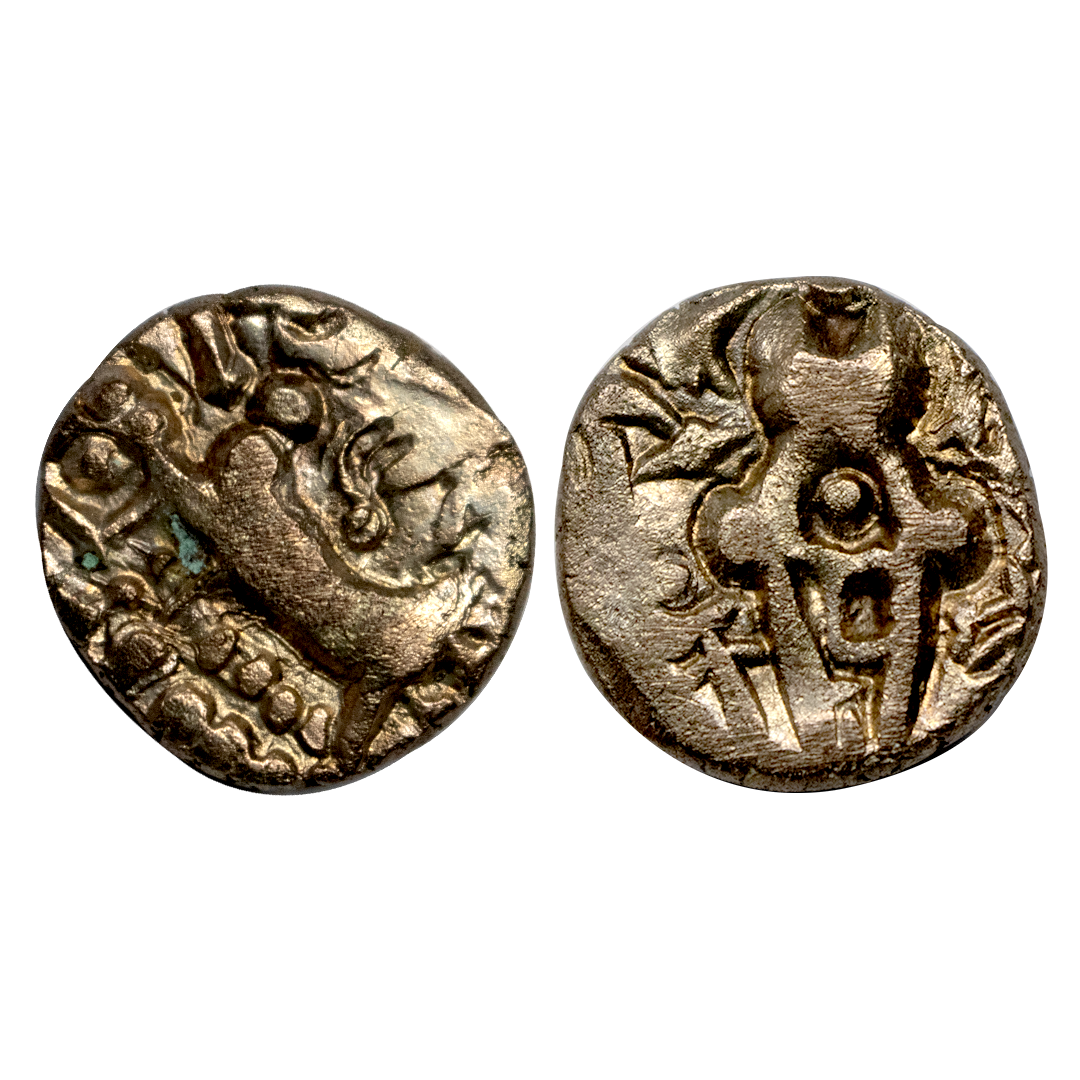 Karkota Dynasty, Kashmir, Pratapaditya (7th Century AD), Debased Gold Dinara, 7.20 gms, Obverse: A crude depiction of standing king, Late Brahmi Legend “KiDa(Ra)” in right field, Reverse: A crude depiction of Goddess Lakshmi, Late Brahmi Legend “ShriPraTaPa” in right field, “(Di)Tya” in left field, Deyell # Treasure, Trade and Tradition, Fig. 4.1, very fine, scarce.