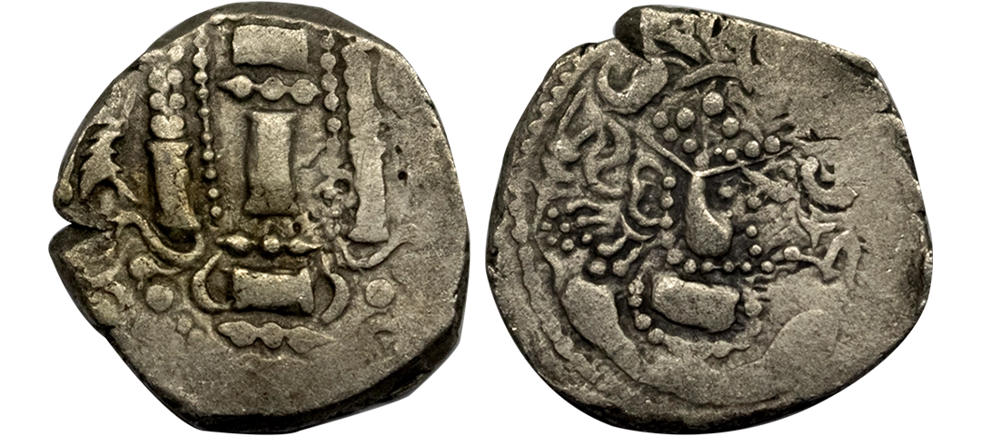Indo Sassanian type, Anonymous issue from NW India, (7th-8th Century AD), Billon Unit, 3.72 gms, Obverse: Bust of King to right within a dotted border, An elobarate diadem on the king’s head, Reverse: A crude depiction of the Sassanian fire altar flanked by attendents, A dotted border around, fine to very fine, scarce.
