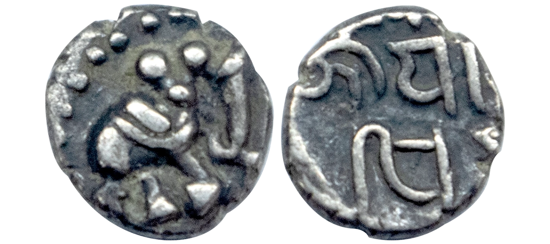 Chalukyas of Gujarat, Siddharaja Jayasimha, (1094-1144 AD), Silver Dramma, Wt : 0.47 gm, Obv. Elephant advancing right; around, dotted border. Rev. ‘SRIMAD JAYASIMHAPRIYA’ ('The Fortunate and Victorious Lion' in Nagari), Deyell #163a, very fine, rare.