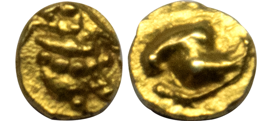 Kalachuris of Tripuri, Gangeya Deva (1015-1040 AD), Gold 4-1/2 Masha, 4.11 gms, Obverse: Goddess Lakshmi seated in padmasana wearing a head gear and necklace, Reverse: Legend in Nagari script in three lines within dotted border reading ‘Srimadga/ngeyade/vah, Deyell # 119, very fine, very scarce.