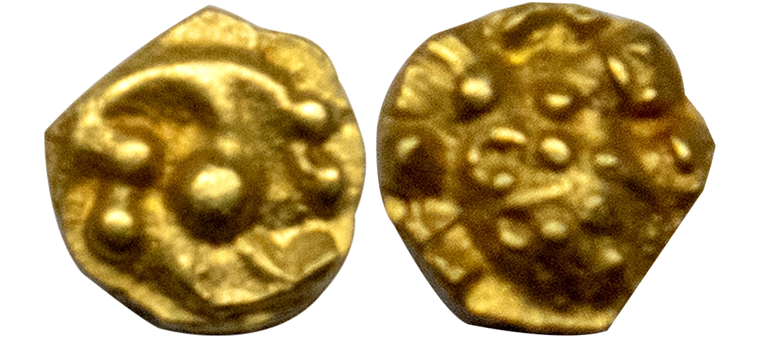 Kalachuris of Tripuri, Gangeya Deva (1015-1040 AD), Gold 4-1/2 Masha, 4.11 gms, Obverse: Goddess Lakshmi seated in padmasana wearing a head gear and necklace, Reverse: Legend in Nagari script in three lines within dotted border reading ‘Srimadga/ngeyade/vah, Deyell # 119, very fine, very scarce.