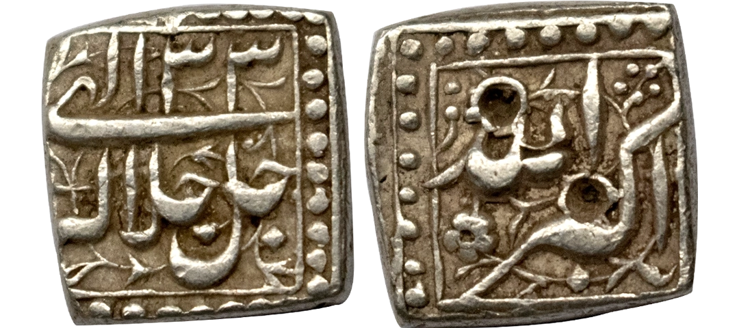 Akbar (AH 963-1014, 1556-1605 AD), Silver Square Rupee, 11.36 gms, Mintless, Monthless, Type, Jalla Jalalahu, Year 33, KM # 91.1, very fine, scarce.