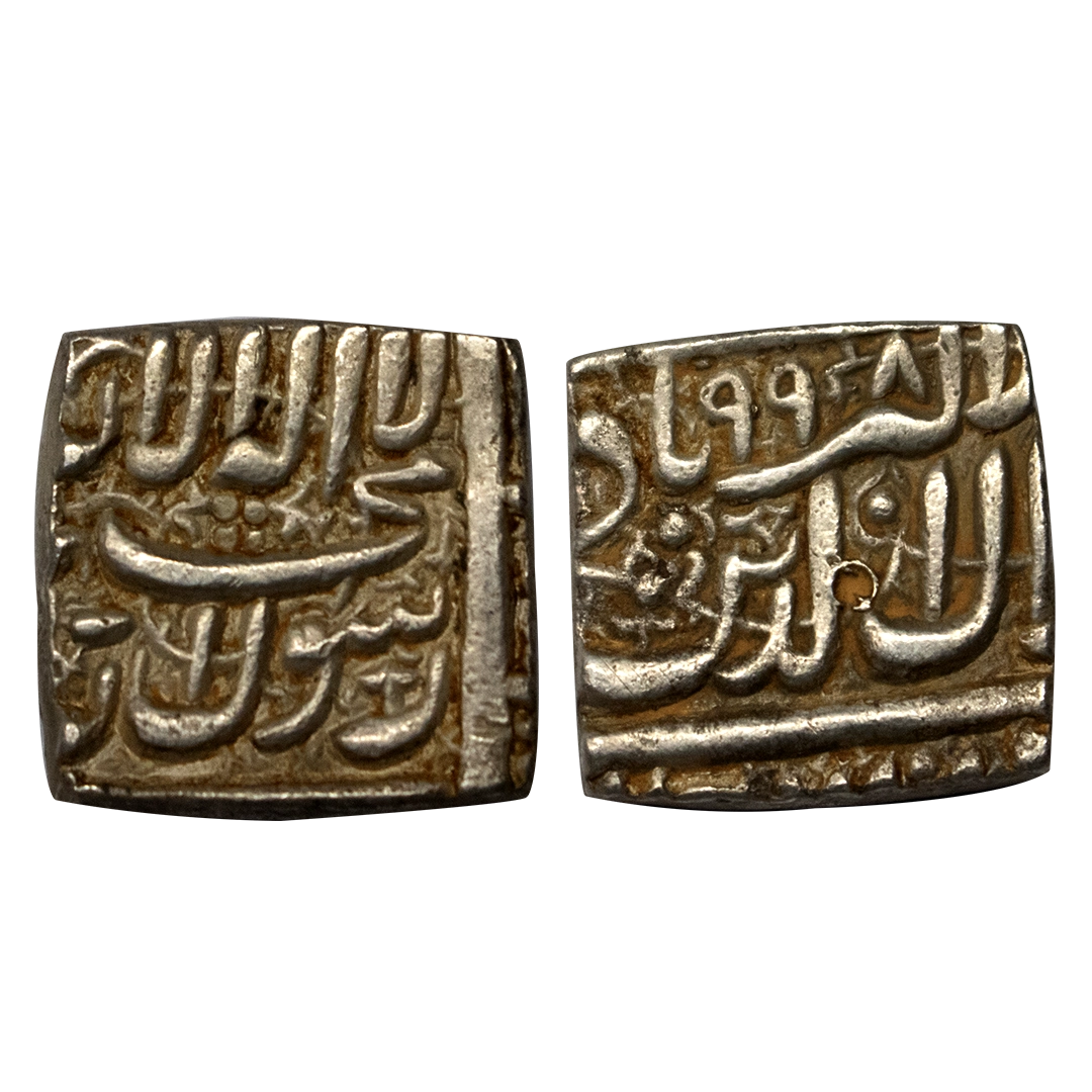 Akbar (AH 963-1014, 1556-1605 AD), Silver Square Rupee, 11.23 gms, Ahmadabad Mint, AH 999, KM # 82.1, very fine, scarce.