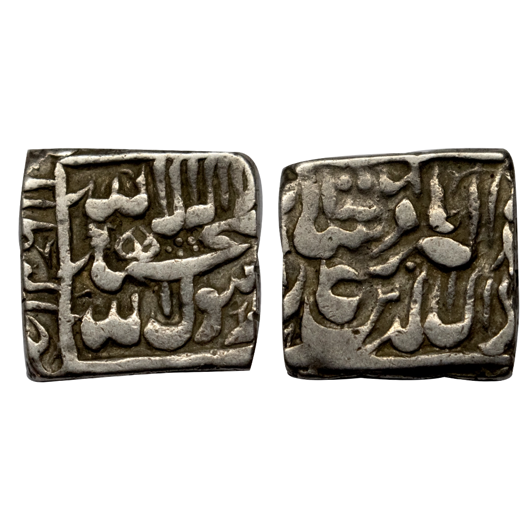 Akbar (AH 963-1014, 1556-1605 AD), Silver Square Rupee, 11.28 gms, Dar-ul-Sultanat Ahmedabad Mint, AH 998, KM # 82.1, very fine, scarce.