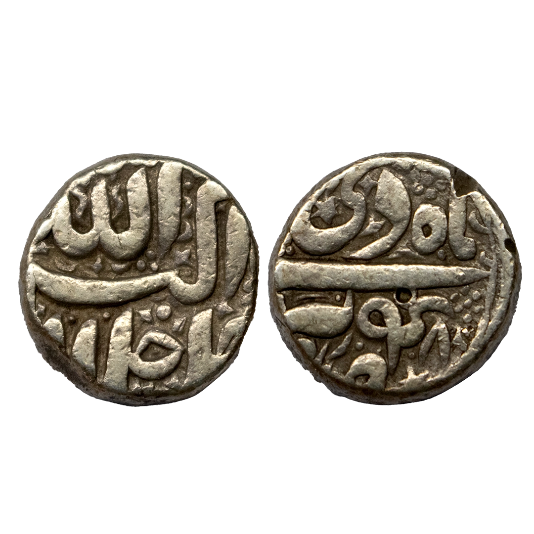 Akbar (AH 963-1014, 1556-1605 AD), Silver Rupee, 11.22 gms, Rebellion Issue of Jahangir, Allahabad Mint, “Bagharb -O- Sharq” couplet, KM # 97.1, very fine+, very scarce.