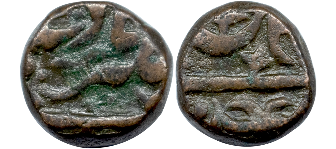 Akbar (AH 963-1014, 1556-1605 AD), Copper ½ Dam, 9.42 gms, Dar al-Khilafat Shahgarh urf Qanauj Mint, AH 969, “stephen cross" as a mint mark on rev, anti clockwise Swastika symbol on obv, very fine, rare.