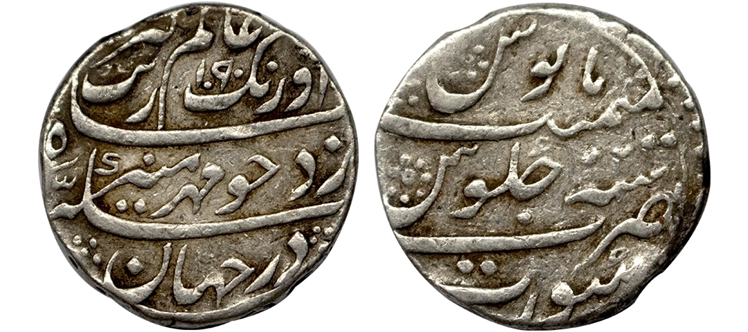 Aurangzeb (AH 1068-1118, 1658-1707 AD), Silver Rupee, 11.46 gms, Surat Mint, AH 1090, Meher e Munir Couplet, Struck from gold mohur die, usually surat mint coins are seen with badr e munir. Unpublished, Extremely fine, Extremely Rare.