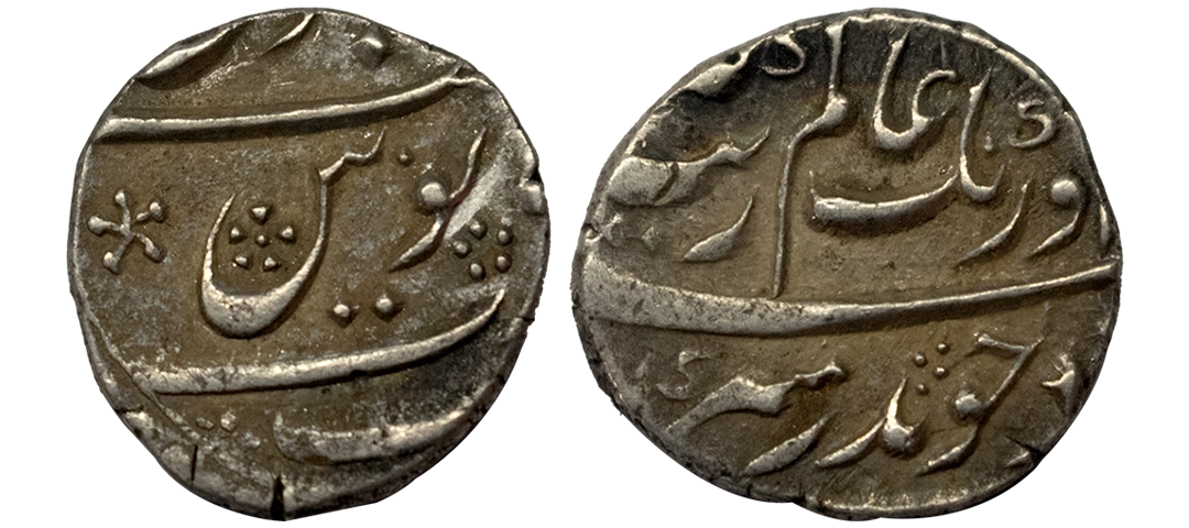 Aurangzeb (AH 1068-1118, 1658-1707 AD), Silver Rupee, 11.46 gms, Surat Mint, AH 1090, Meher e Munir Couplet, Struck from gold mohur die, usually surat mint coins are seen with badr e munir. Unpublished, Extremely fine, Extremely Rare.