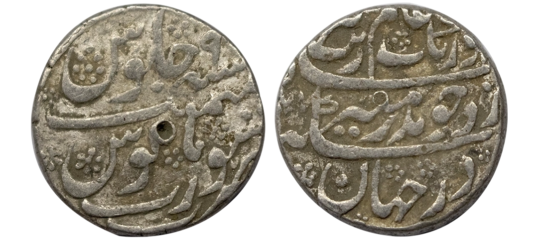 Aurangzeb (AH 1068-1118, 1658-1707 AD), Silver Rupee, 11.46 gms, Surat Mint, AH 1090, Meher e Munir Couplet, Struck from gold mohur die, usually surat mint coins are seen with badr e munir. Unpublished, Extremely fine, Extremely Rare.