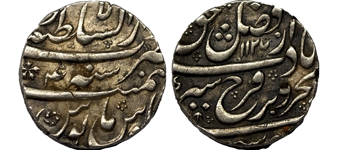 Farrukhsiyar (AH 1124-1131, 1713-1719 AD), Silver Rupee, 11.45 gms, Dar-us-Sarur Burhanpur Mint, “Bahr-o-bar” Couplet, AH 1129, RY 6, KM # 377.22, very fine+, very scarce.