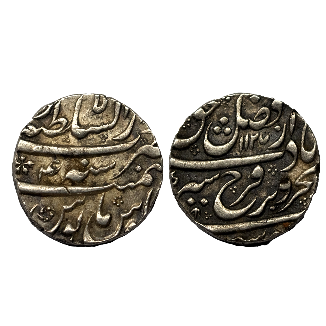 Farrukhsiyar (AH 1124-1131, 1713-1719 AD), Silver Rupee, 11.37 gms, Gwalior Mint, AH 1130, RY 7, KM # 377.30, very fine+, scarce.