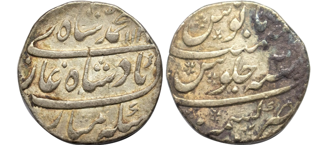 Muhammad Shah (AH 1131-1161, 1719–1748 AD), Silver Rupee, 11.47 gms, Farkhanda Bunyad Hyderabad Mint, KM# 436.26, very fine, very scarce.