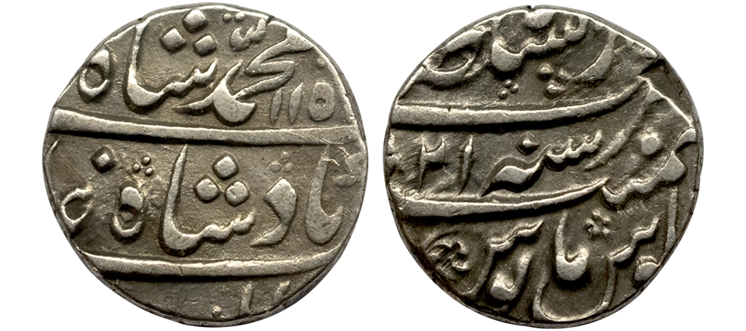 Muhammad Shah (AH 1131–1161, 1719–1748 AD), Silver Rupee, 11.29 gms, Kora Mint, AH 1134, RY 3, KM # 436.39, very fine, scarce.