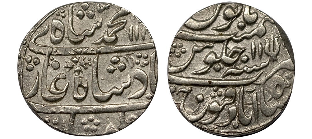 Muhammad Shah (AH 1131–1161, 1719–1748 AD), Silver Rupee, 11.38 gms, Murshidabad Mint, AH 1134, RY 3, KM # 436.18, very fine, scarce.