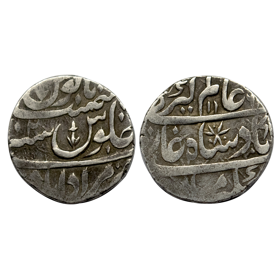 Maratha Confideracy, East India Company Issue, Silver Rupee, 11.05 gms, Bagalkot Mint (pseudo mint name Dar ul-Khilafa Shahjahanabad), AD 1819, KM # 348, very fine, very scarce.
