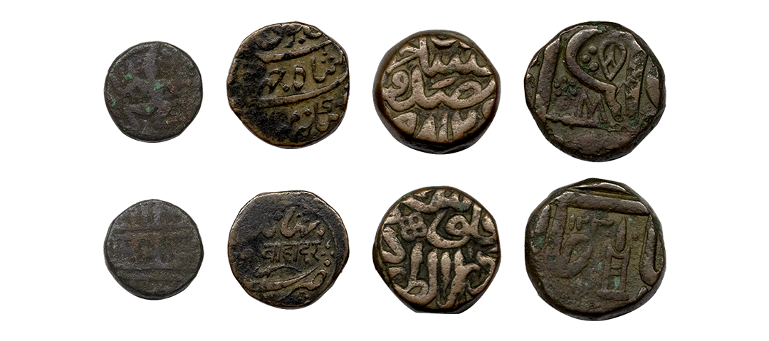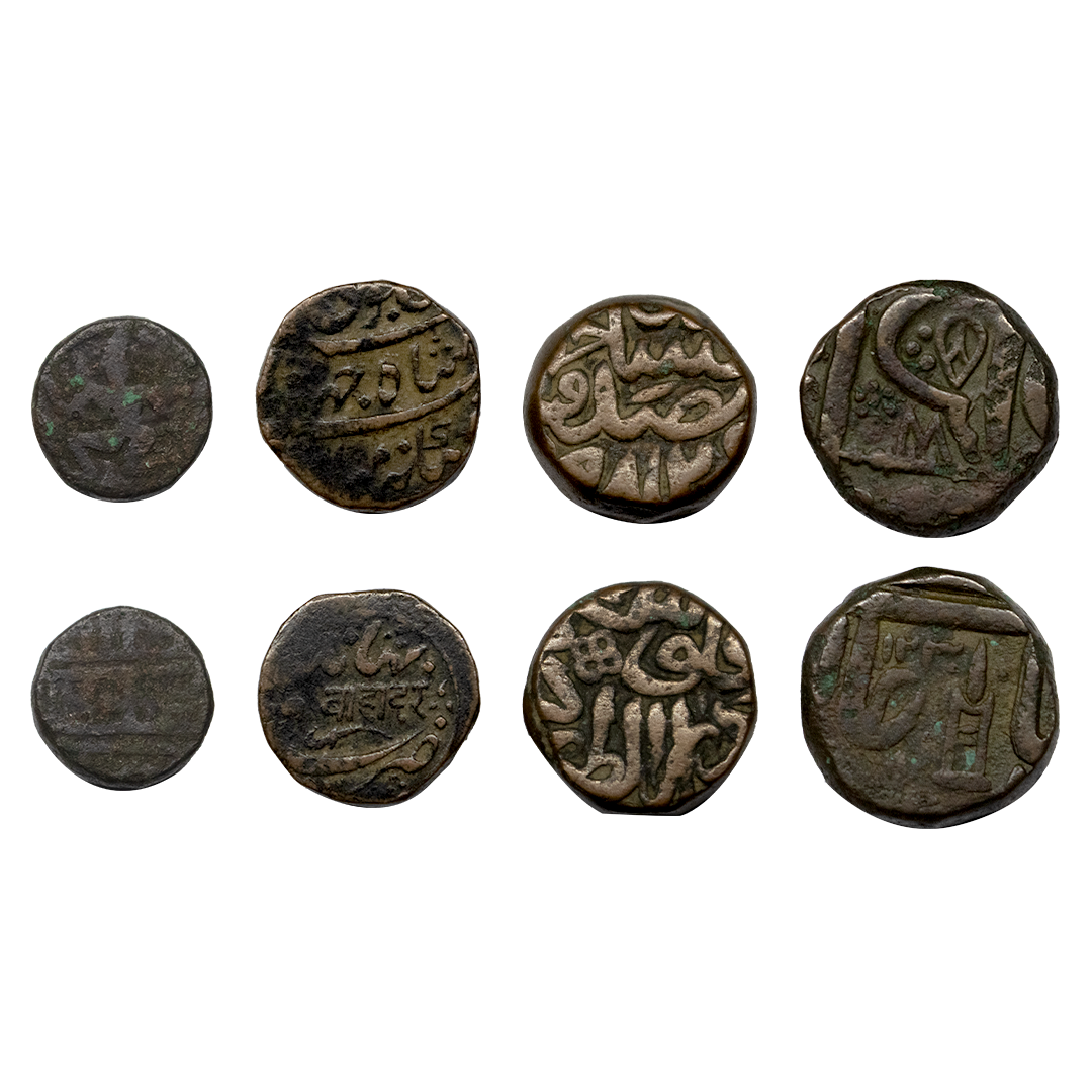 Set of 4 Copper coins, Bhaunagar State, Akbar Copper Dam, Indore State Half Anna, very fine.