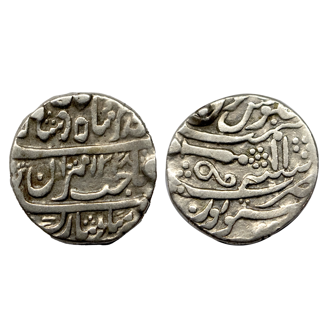 Gwalior State, Daulat Rao (AH 1209-1243, 1794-1827 AD), INO Muhammad Akbar II (AH 1221-1253, 1806-1837 AD), Silver Rupee, 10.86 gms, Sheopur Mint, AH 1228, RY 11, canon as a Mint Mark, KM # 201, fine+, scarce.
