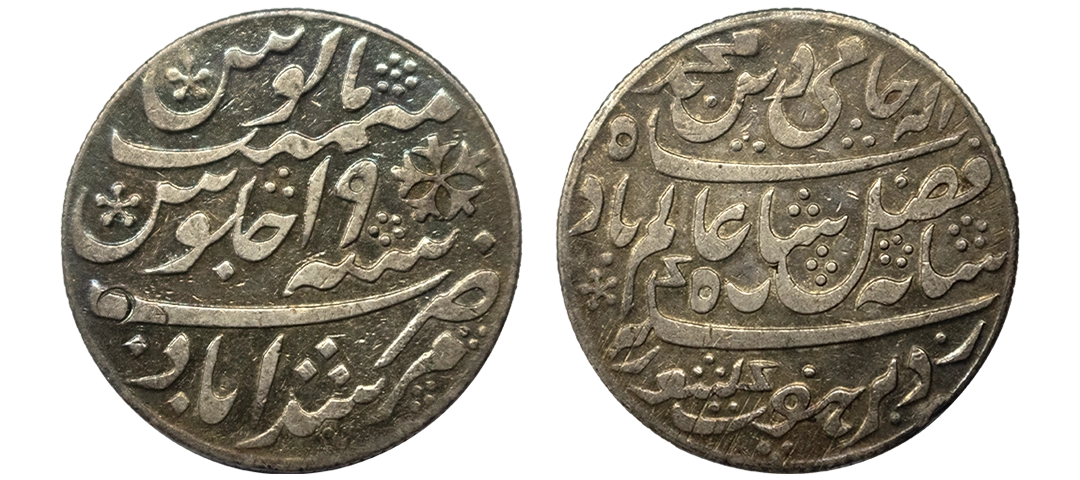 Bengal Presidency, INO Shah Alam II (AH 1174-1221, 1759-1806 AD), Silver ½ Rupee, 5.73 gms, Murshidabad Mint, RY 19, Prid #180, very fine, scarce.