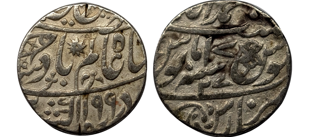 Bengal Presidency, INO Shah Alam II (AH 1174-1221, 1759-1806 AD), Silver ½ Rupee, 5.73 gms, Murshidabad Mint, RY 19, Prid #180, very fine, scarce.