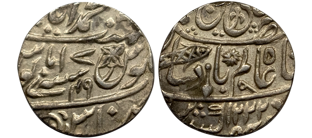 Bengal Presidency, INO Shah Alam II (AH 1174-1221, 1759-1806 AD), Silver Rupee, 11.35 gms, Muhammadabad Banaras Mint, AH 1222, RY 17/49, KM # 40.1, very fine+, scarce.