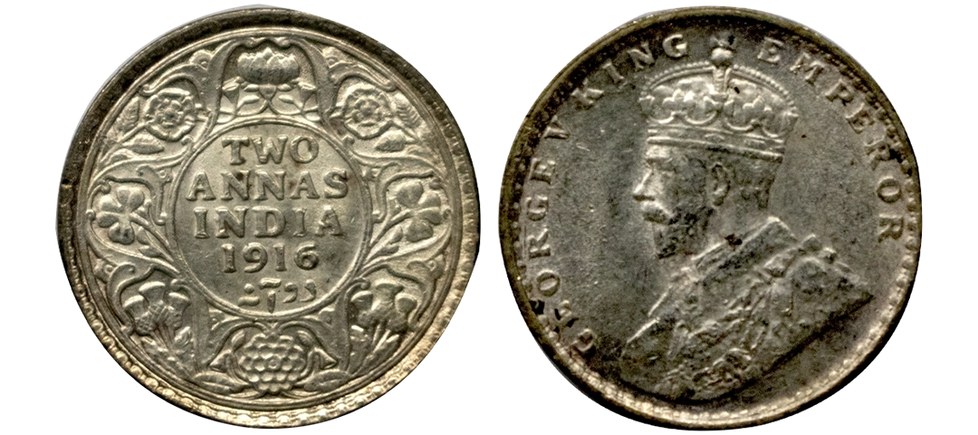George V, Silver 2 Annas, 1916, Calcutta Mint, uncirculated.