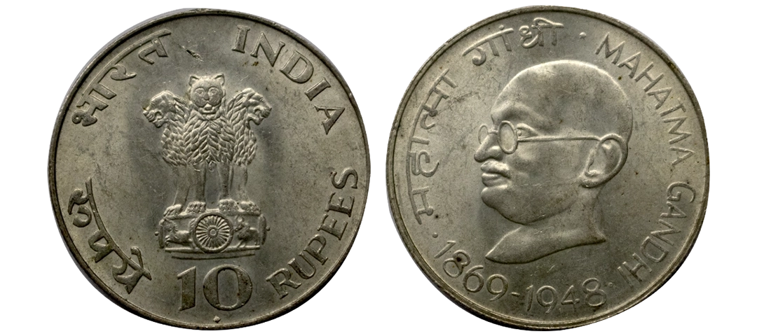 1969, Silver 10 Rupees, Bombay Mint, Centennial Mahatma Gandhi's Birth, brilliant uncirculated.