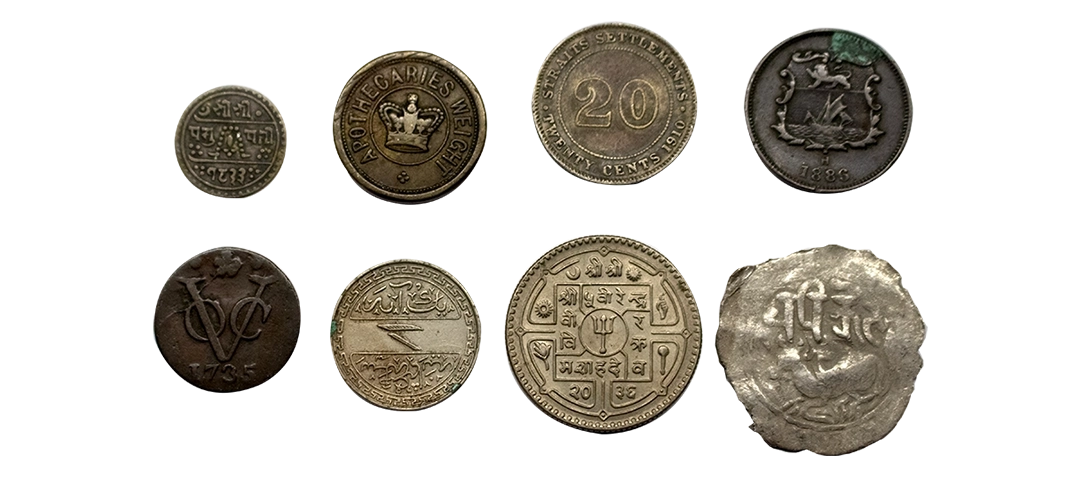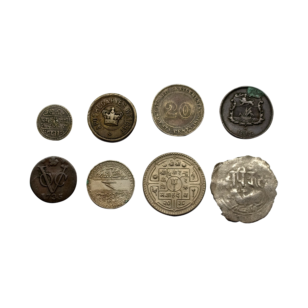 Group of 8 Coins, Nepal Sukki of Prithvi Veer Vikram, Straits Settlement 20 cents, Dutch East india, Nizam Hyderabad & Harikela Dynasty, fine to very fine.