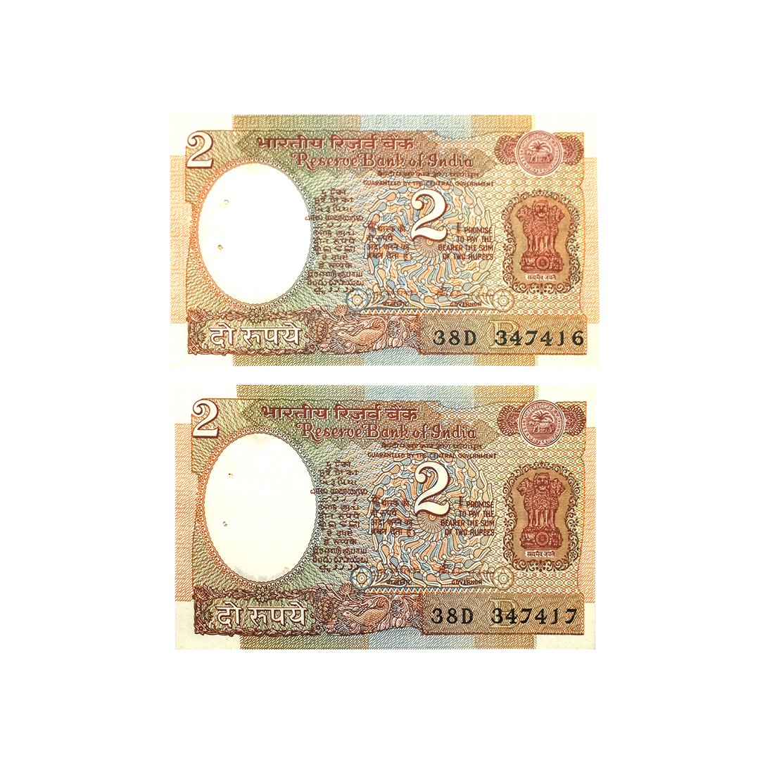 Republic India, 2 Rupees, Satellite series, 38D 347416 & 38D 347417, B inset, iNVERTED WATERMARK IN WATERMARK PANEL, Set of 2, extra fine, scarce.