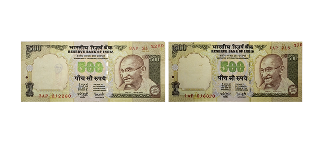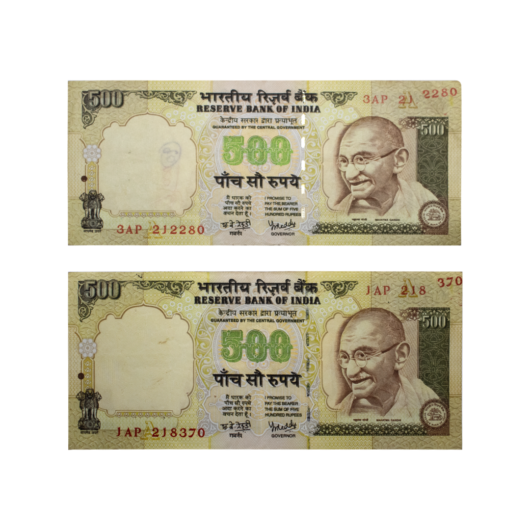 Republic India, 500 Rupees, Gandhi Series, Y.V. Reddy, Serial Number Shifting Error, 3 AP 212280 with inset A, 1AP 218370 with inset A, set of 2 notes, extra fine, rare.