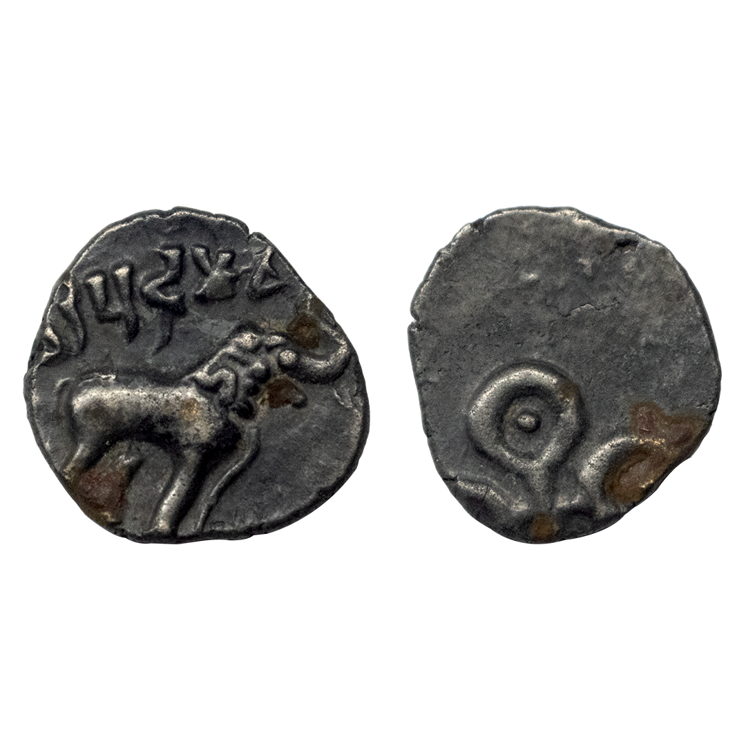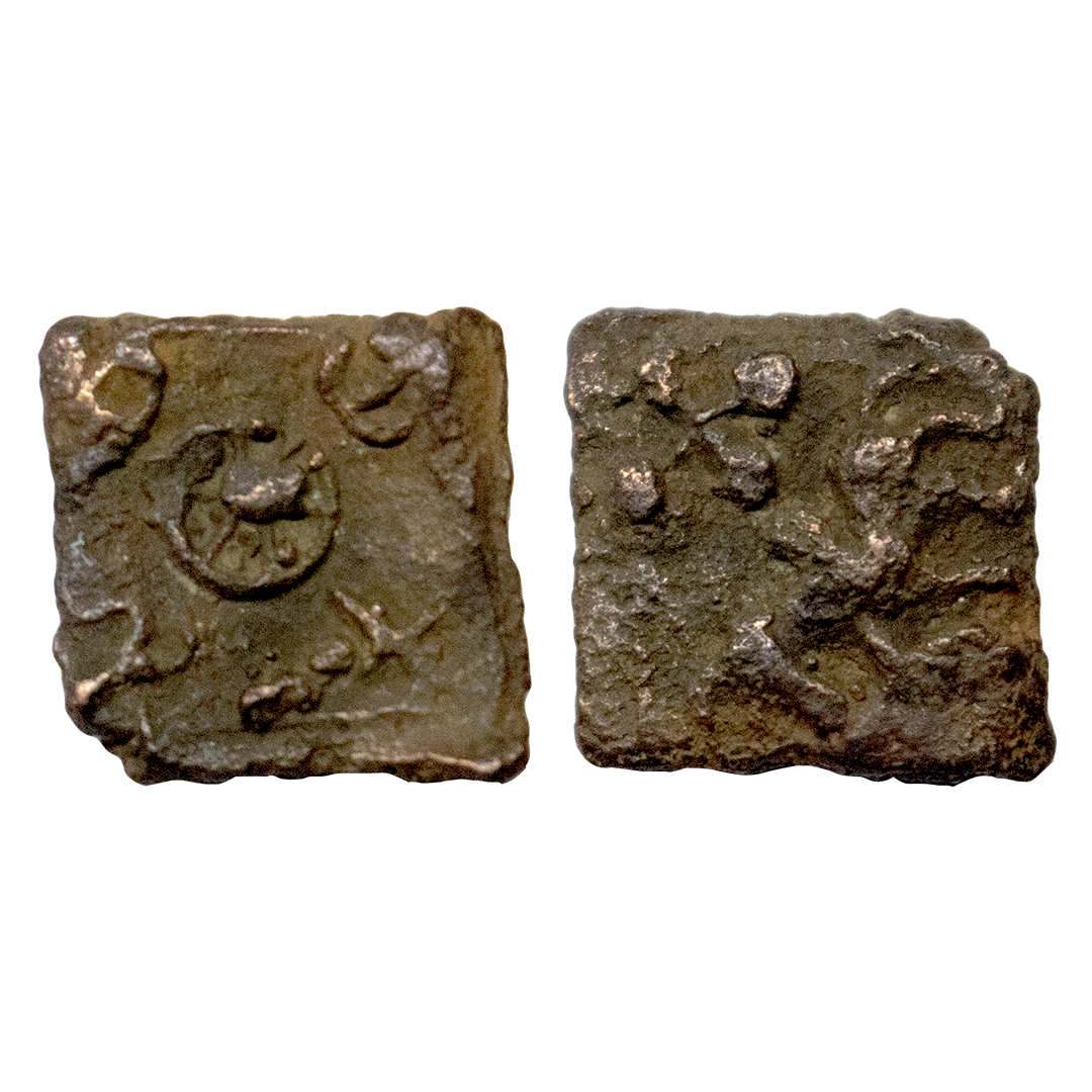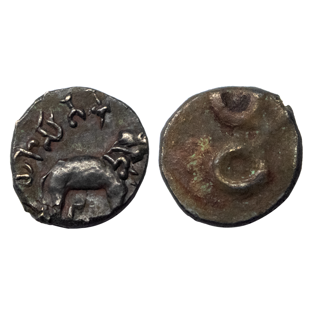 Satavahanas, (2nd-1st Century BC), Copper Unit, 2.37 gms, Obverse: Elephant to right with raised trunk, Reverse: Tree in railing with seven branches, very fine.