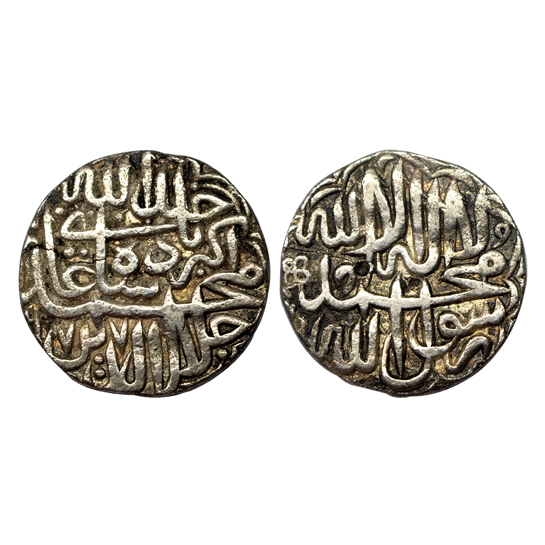 Akbar, Lahore mint, Silver, Rupee, Allahu Akbar type. Broad flan, Ilahi 45, Tir Month. Test marks, Very Fine+, Scarce.