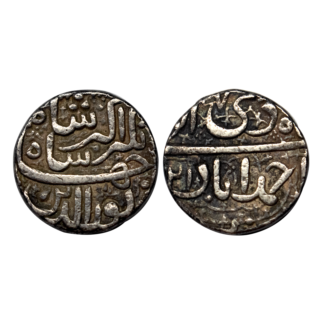Jahangir, Ahmedabad Mint, Silver, Rupee, Nuruddin type, Di Month, AH 1021, RY 7; complete mint name on rev. Test marks, Very Fine+, Rare with both the years.