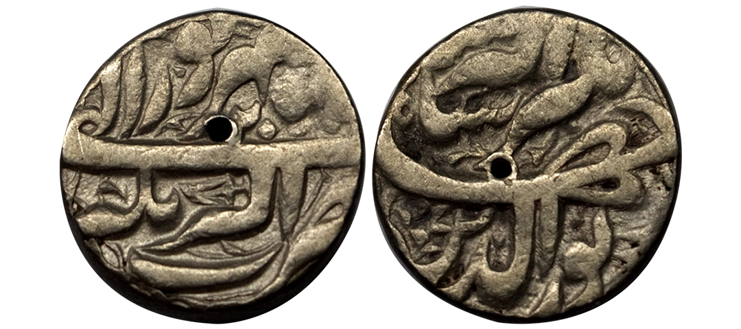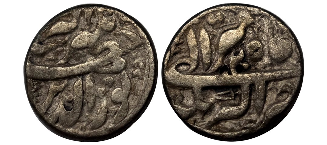 Jahangir, Akbarnagar Mint, Silver, Rupee, Nuruddin type, Isfandarmuz Month, RY 19; a Sword as a mint mark above the mint name on rev. Test marks, Very Fine+, Rare.