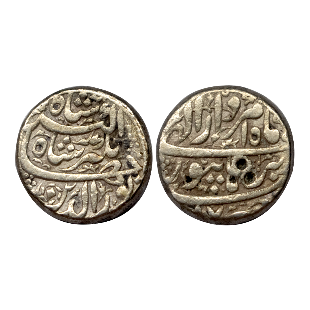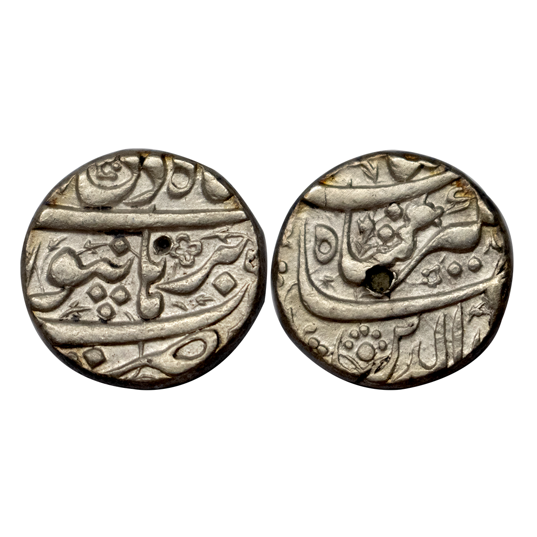 Jahangir, Burhanpur Mint, Silver, Rupee, Din Panah couplet type, complete mint name at the centre on rev, decorated fields, RY 7. Test marks, Very Fine+, Rare.