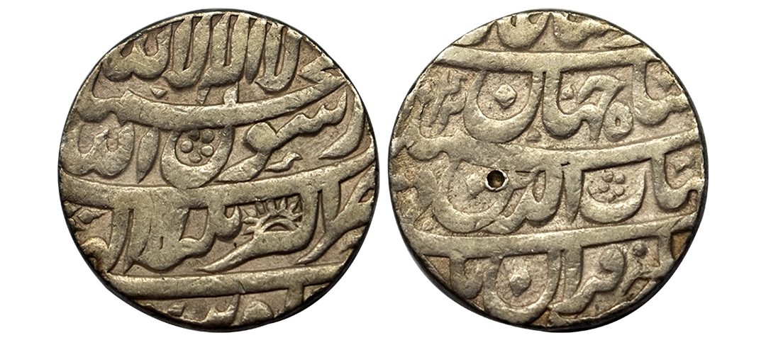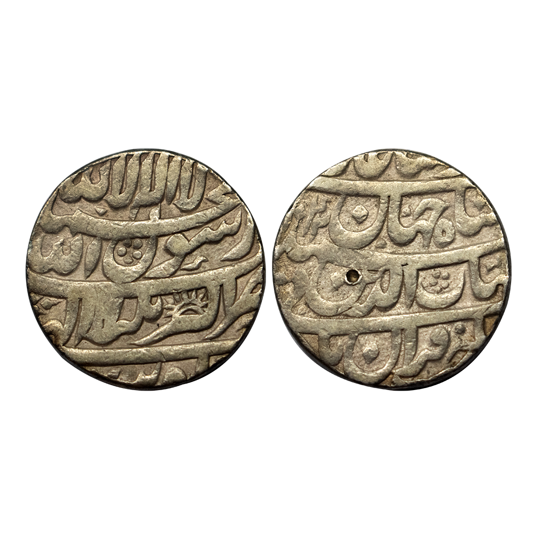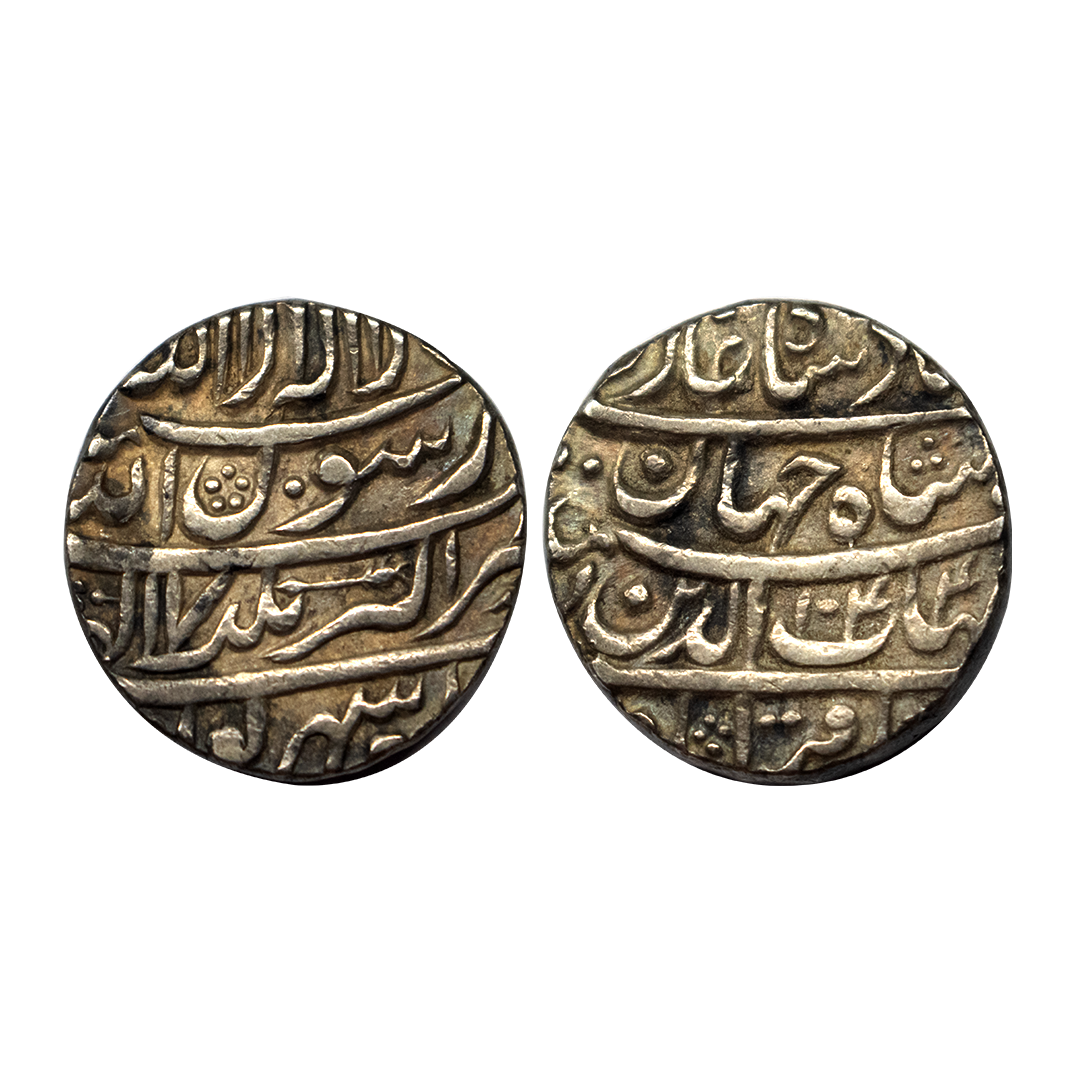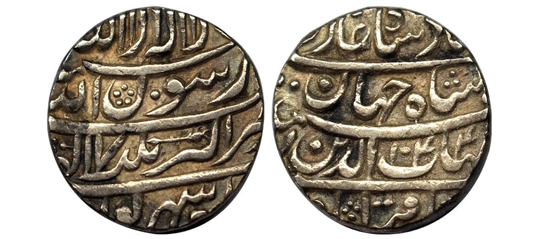 Shah Jahan, Akbarabad Mint, Silver, Rupee, Dotted-Square-area type with complete mint name in the bottom margin on rev, AH 1061, RY 25. Centrally struck, Test marks, About Extremely Fine+, Rare.