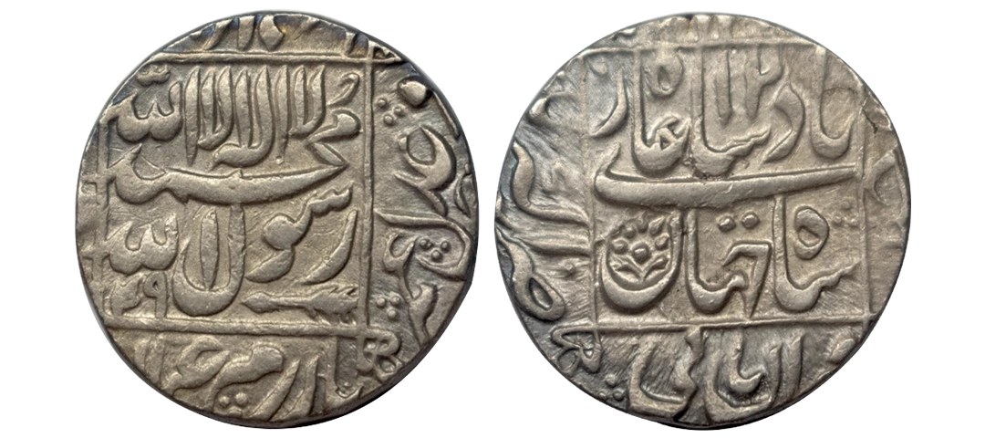 Shah Jahan, Akbarnagar Mint, Silver, Error Rupee, four-lines type with complete mint name in the third line on obv, AH 1032 (error year), RY 5, Aban Month. Dagger as a mint mark in the mint name on obv. Test marks, Very Fine+, Rare.