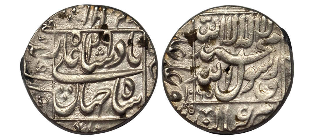 Shah Jahan, Akbarnagar Mint, Silver, Rupee, Square-area type with complete mint name in the left margin on rev, AH 1050, RY 14. An Arrow placed horizontally under Kalima on obv, Centrally struck, No Test marks, Extremely Fine+, Rare