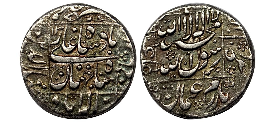 Shah Jahan, Akbarnagar Mint, Silver, Rupee, Square-area type with mint name in the left margin on rev, AH 1058, RY 22. Persian letter Ain (probably an initial of the Mint Master) placed under Kalima on obv, Centrally struck, Test marks, Extremely Fine+, Rare.