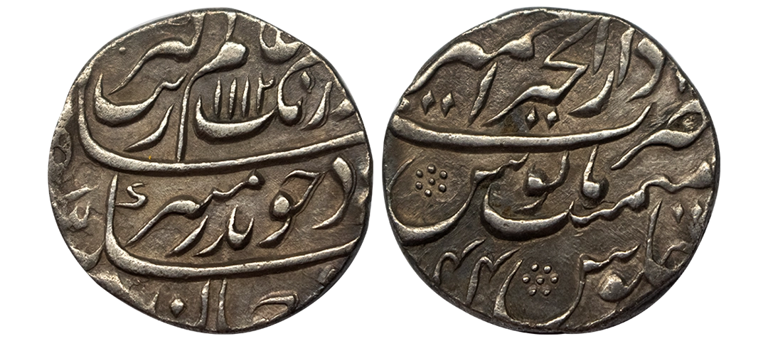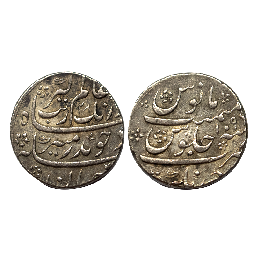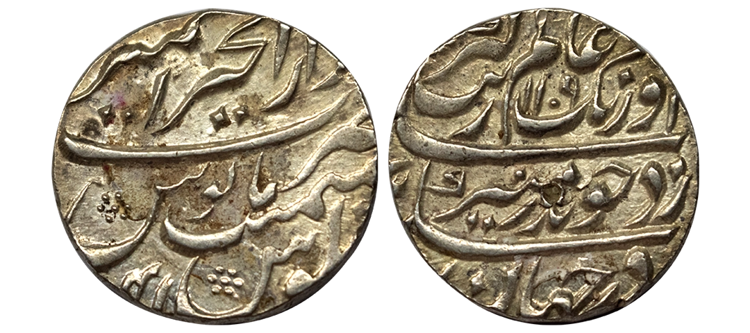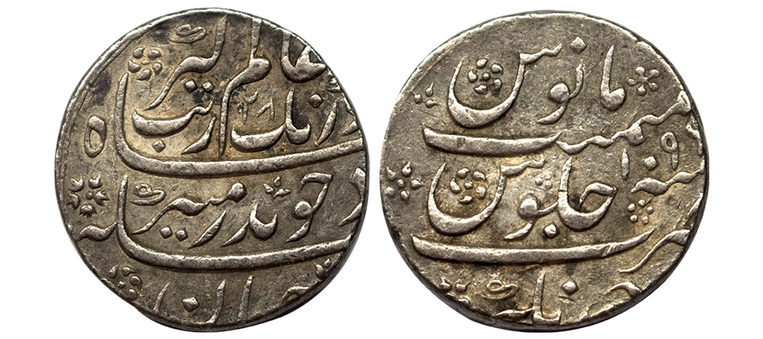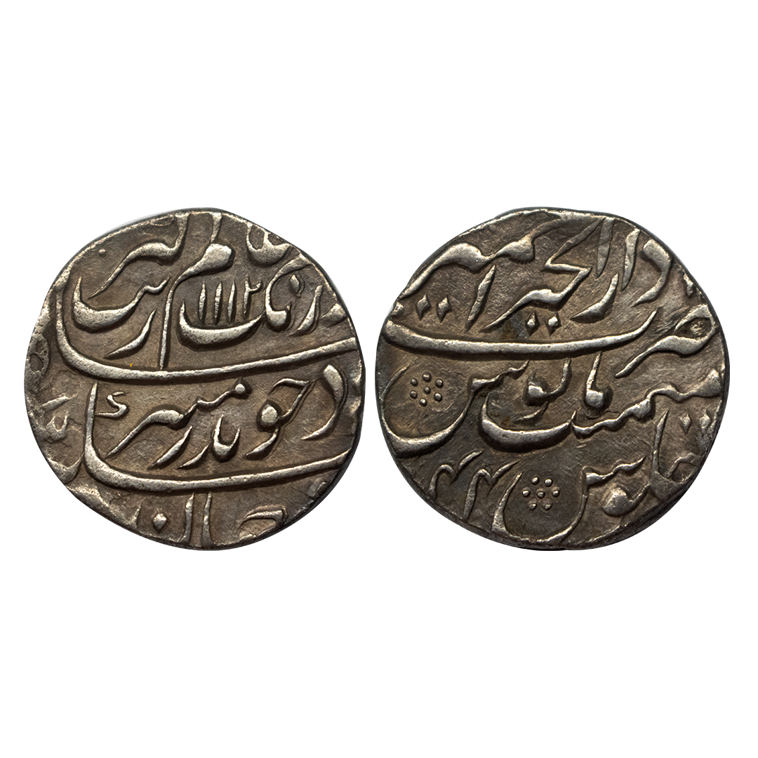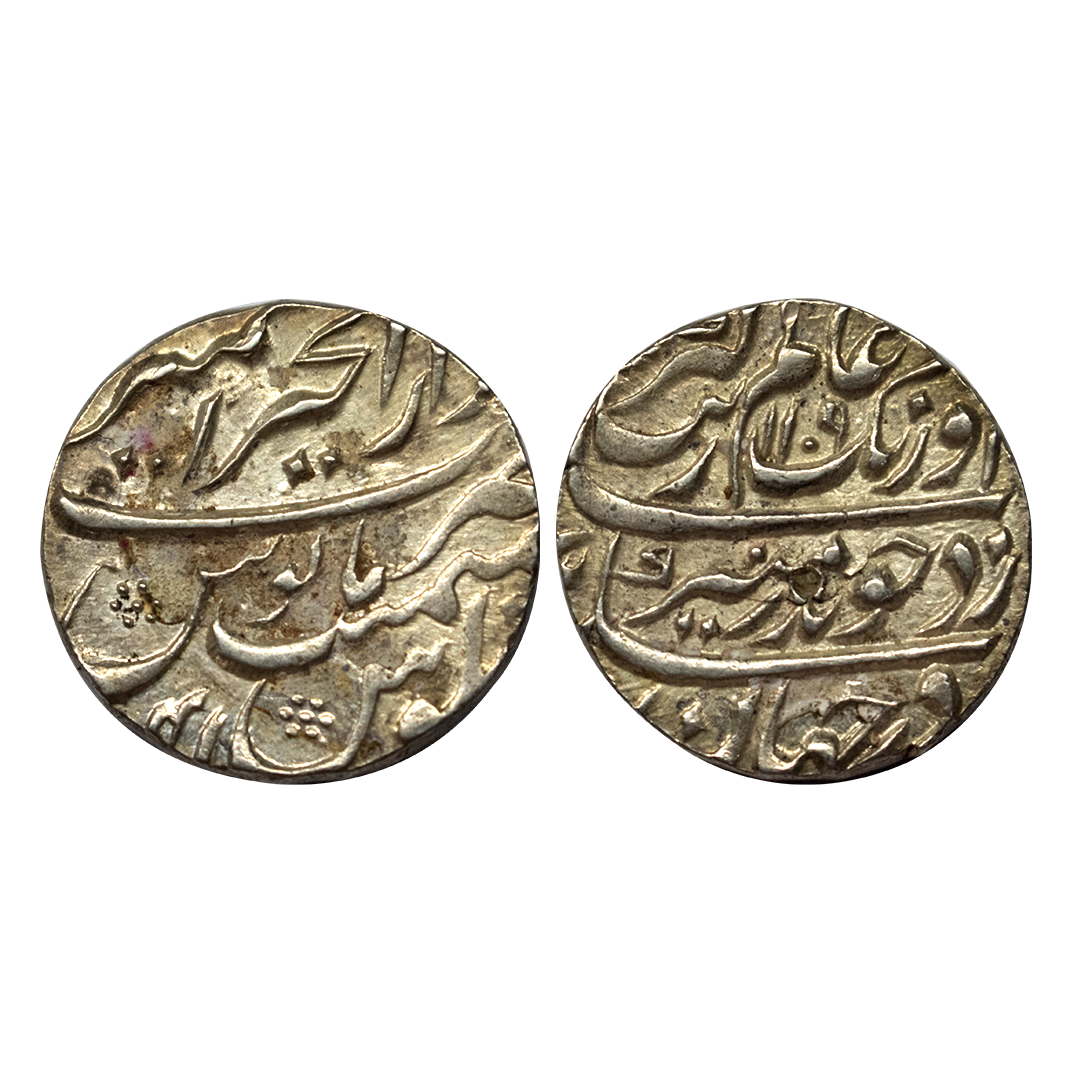 Aurangzeb, Rupee, Ahmedabad Mint, Silver, Badr Munir type. Mint name in the bottom line on rev, AH 1117, RY 49. No Test Marks, Extremely Fine+.