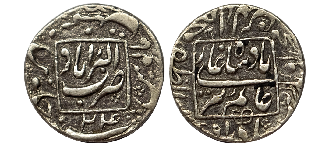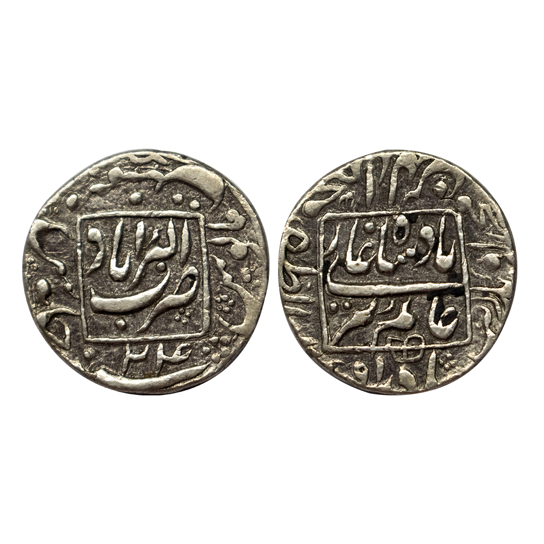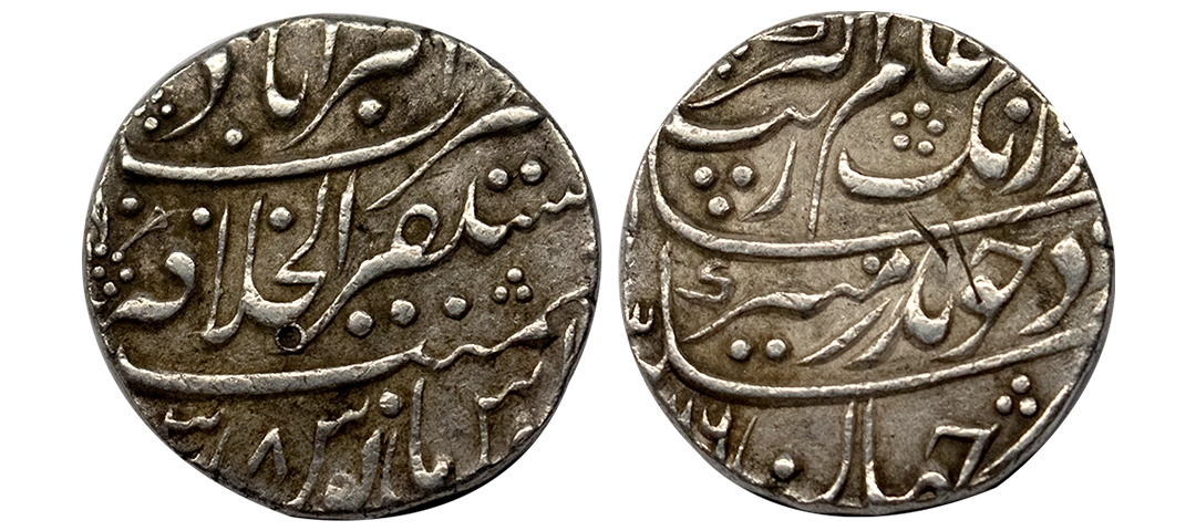 Aurangzeb, Rupee, Ajmer Dar ul Khair Mint, Silver, Badr Munir type. Mint name in the top line on rev, AH 1112, RY 44. Broader flan, No Test Marks, About Extremely Fine.