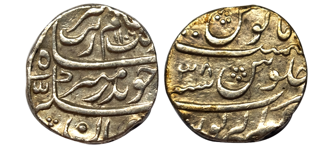 Aurangzeb, Rupee, Akbarabad Mustaqir ul Khilafat Mint, Silver, Badr Munir type. Mint name in the top line on rev, AH 1102, RY 34. Broad Nazarana-like flan, Test Marks, Very Fine, Scarce.