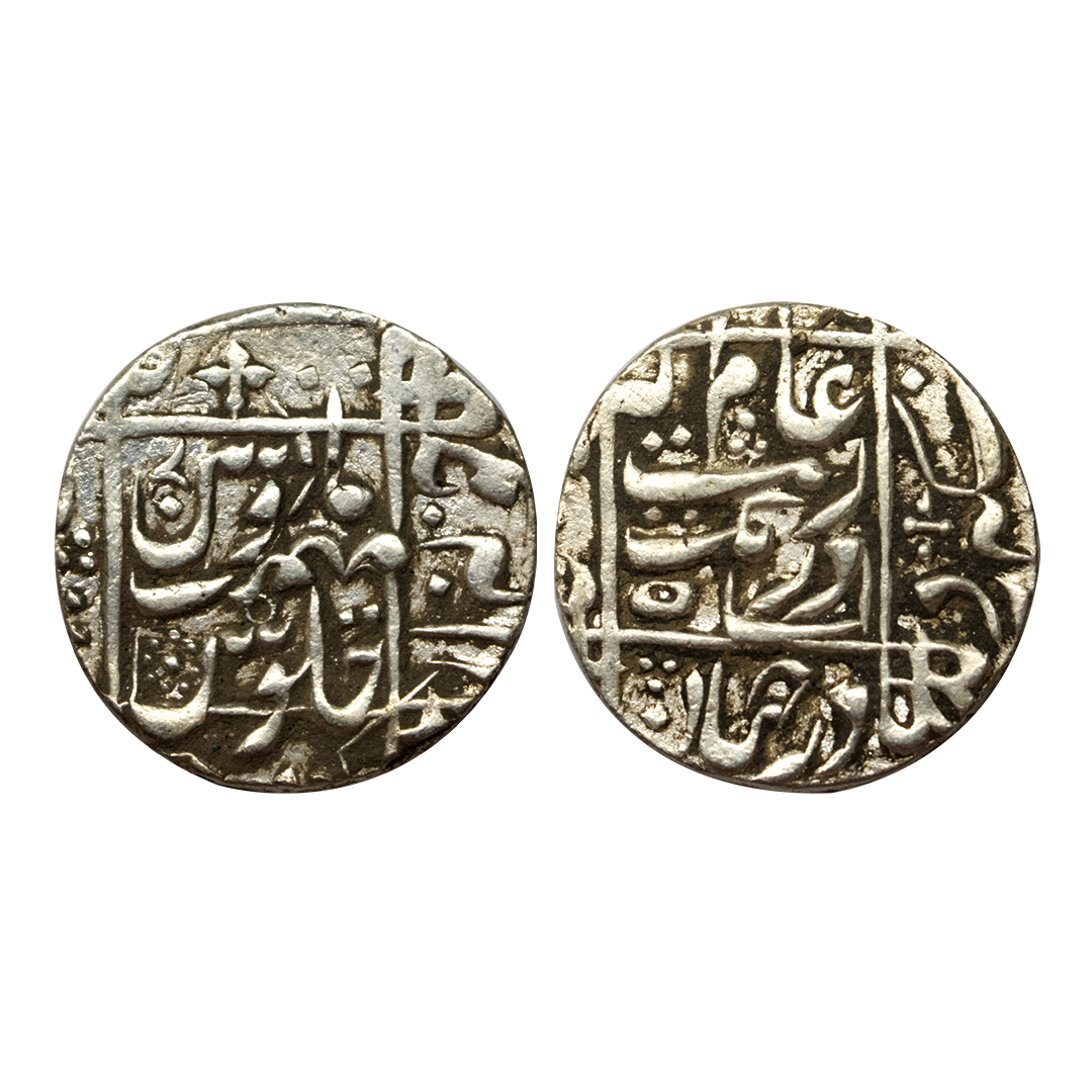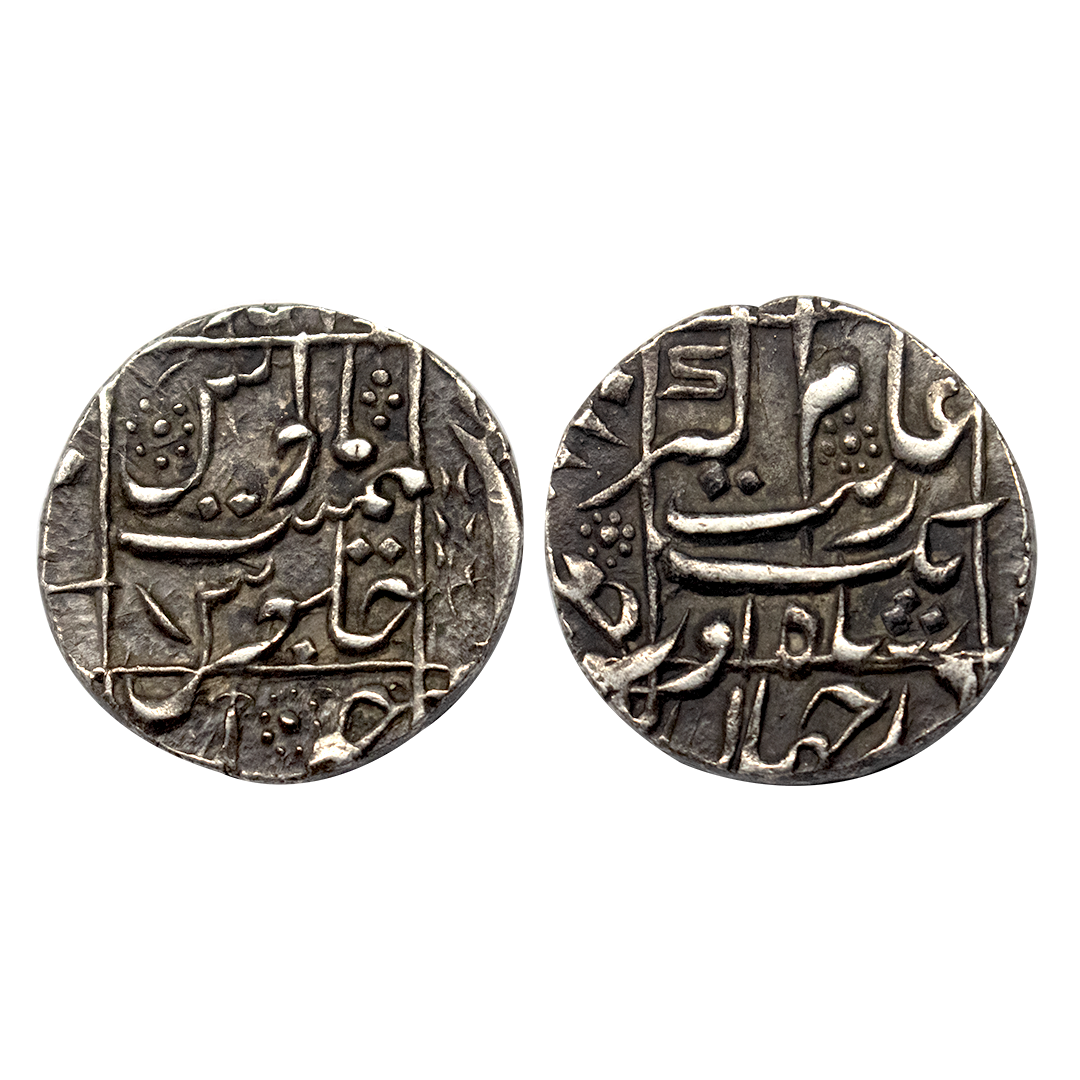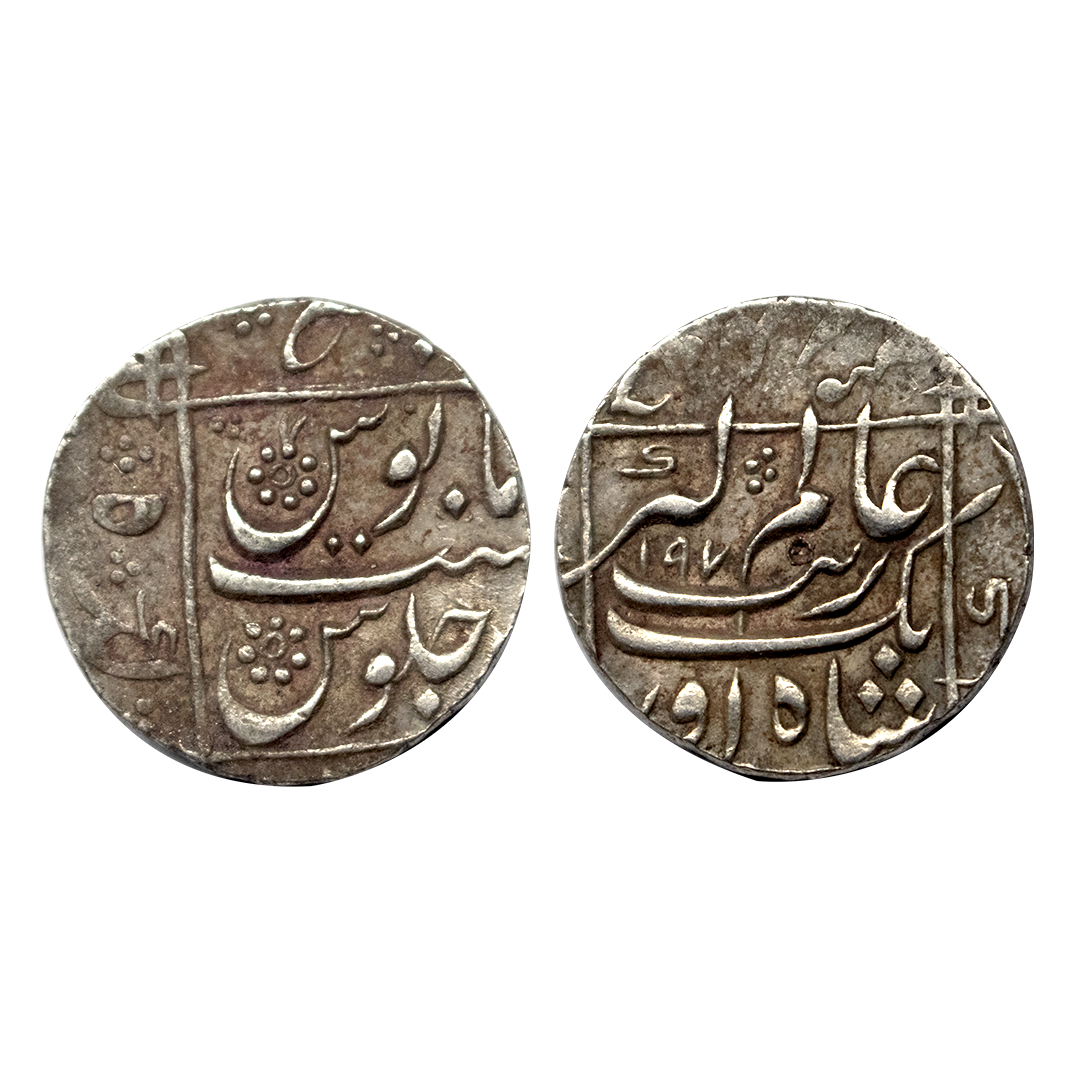 Aurangzeb, Rupee, Junagadh Mint, Silver, Badr Munir type. Mint name in the bottom line on rev, AH 1101, RY 33. Test Marks, Very Fine.