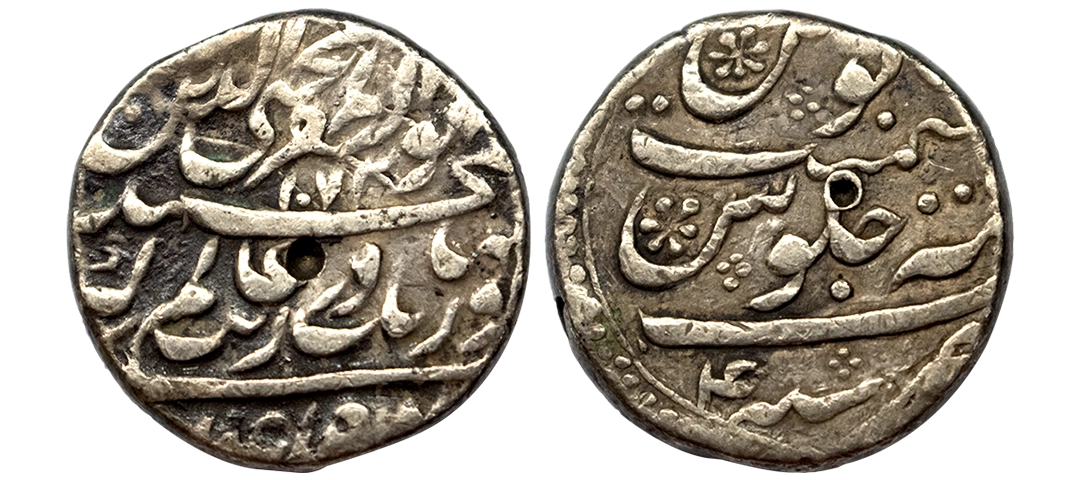 Aurangzeb, Rupee, Tatta Mint, Silver, Muhiuddin type. Complete Mint name in the bottom line on rev, AH 1072, RY 4. Test marks on rev, Very Fine, Scarce.