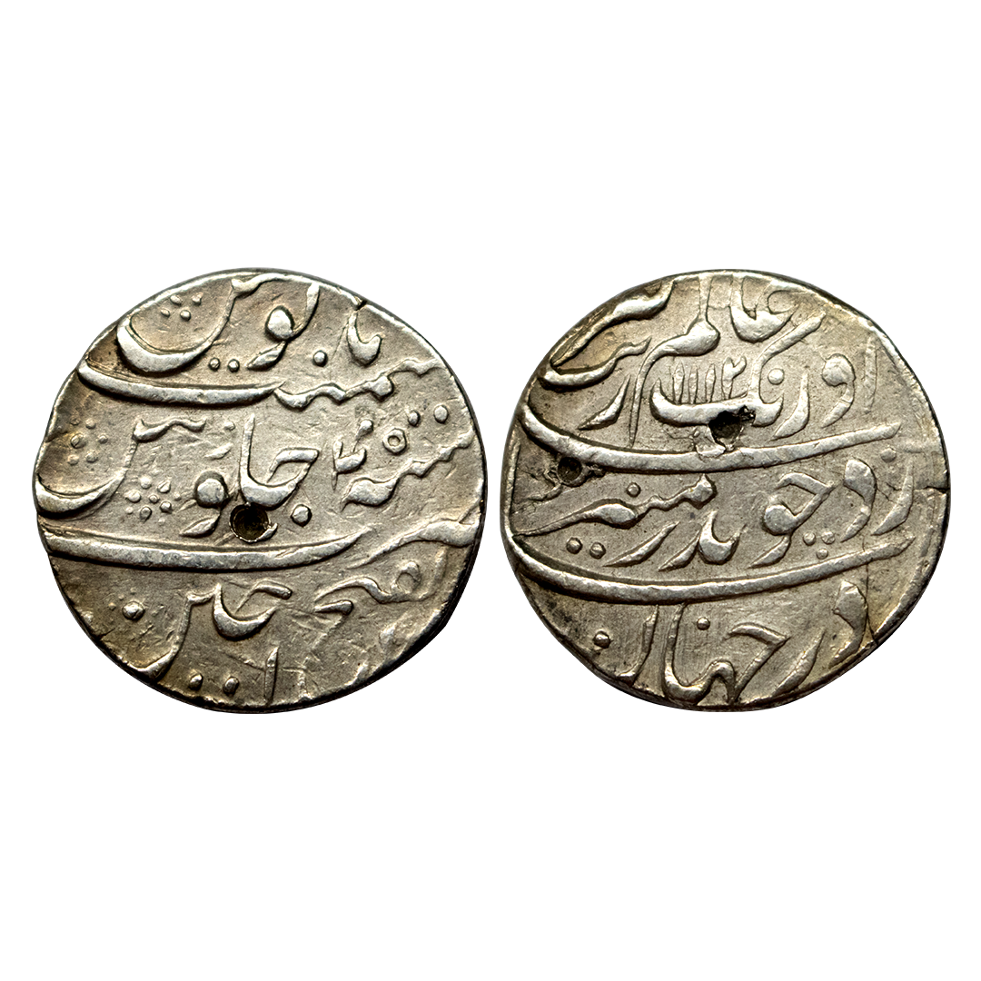 Aurangzeb, Rupee, Ujjain Dar ul Fath Mint, Silver, Badr Munir type. Complete Mint name in the top line on rev, AH 1112, RY 45. Test Marks, About Extremely Fine, Scarce.