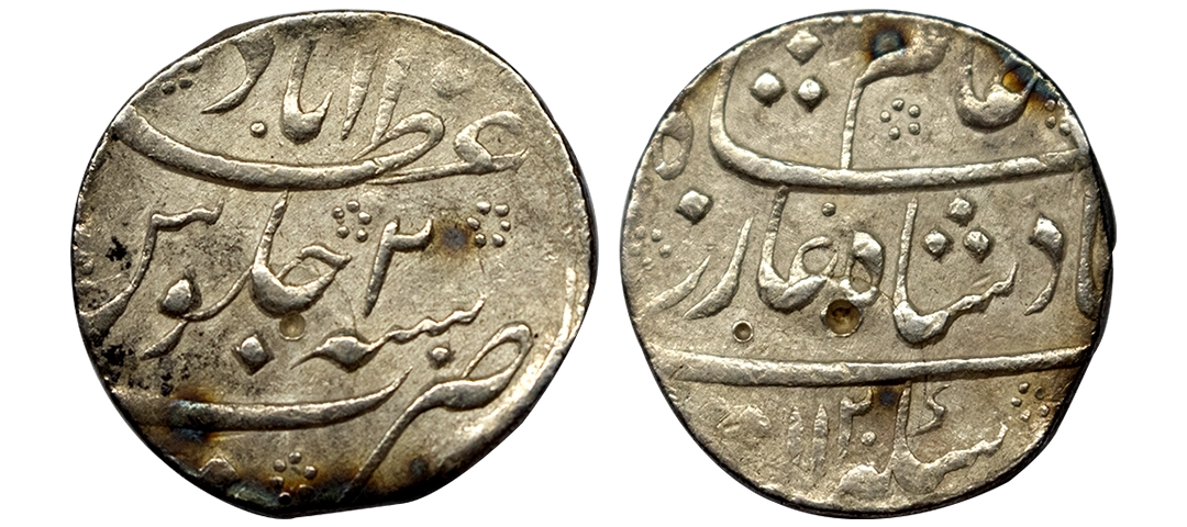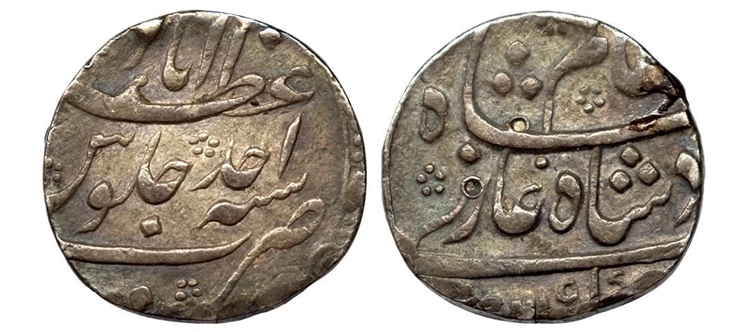 Shah Alam I, Rupee, Ahmedabad Mint, complete Mint name in the bottom line on rev, AH 1120, RY 2. No Test Marks, Almost UNC with lustre.