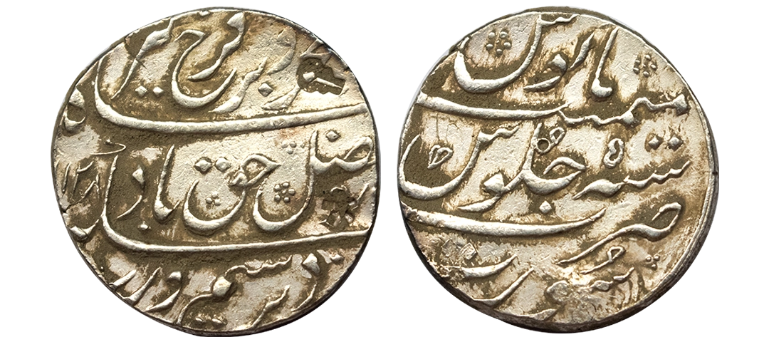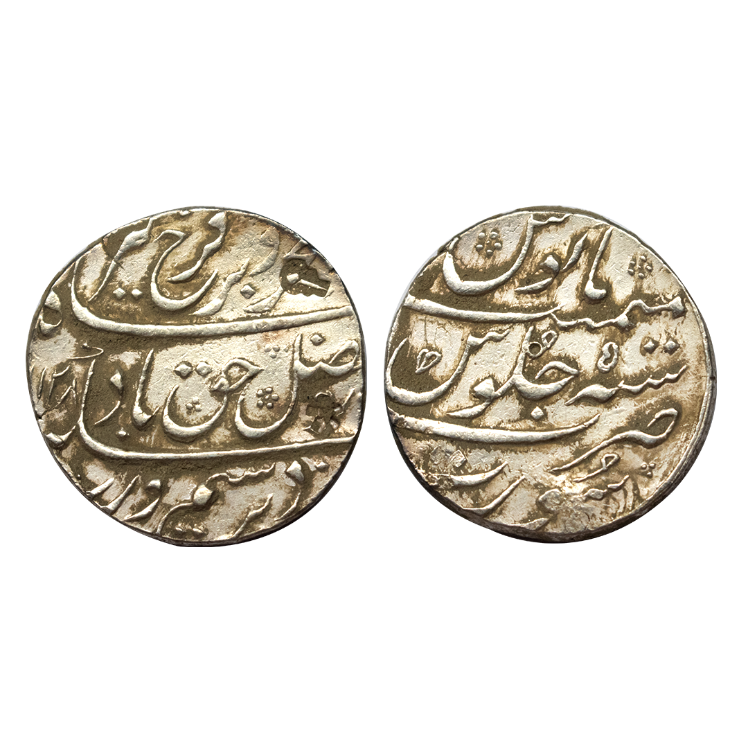 Farrukhsiyar, Rupee, Surat, complete Mint name in the bottom line on rev, Broad flan, AH 1128, RY 5. About Extremely Fine+.